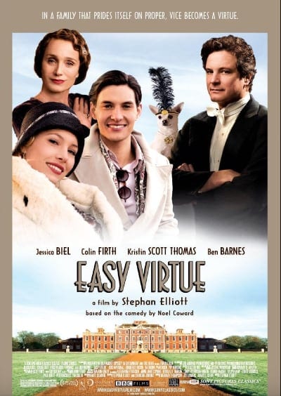 Easy Virtue (2008) – Романтична комедія за Ноелем Кауардом: американська вдова Ларіта імпульсивно виходить заміж за молодого англійця й приїздить у маєток його родини. Сувора свекруха оголошує їй війну, а батько знаходить споріднену душу. IMDB: 6.6