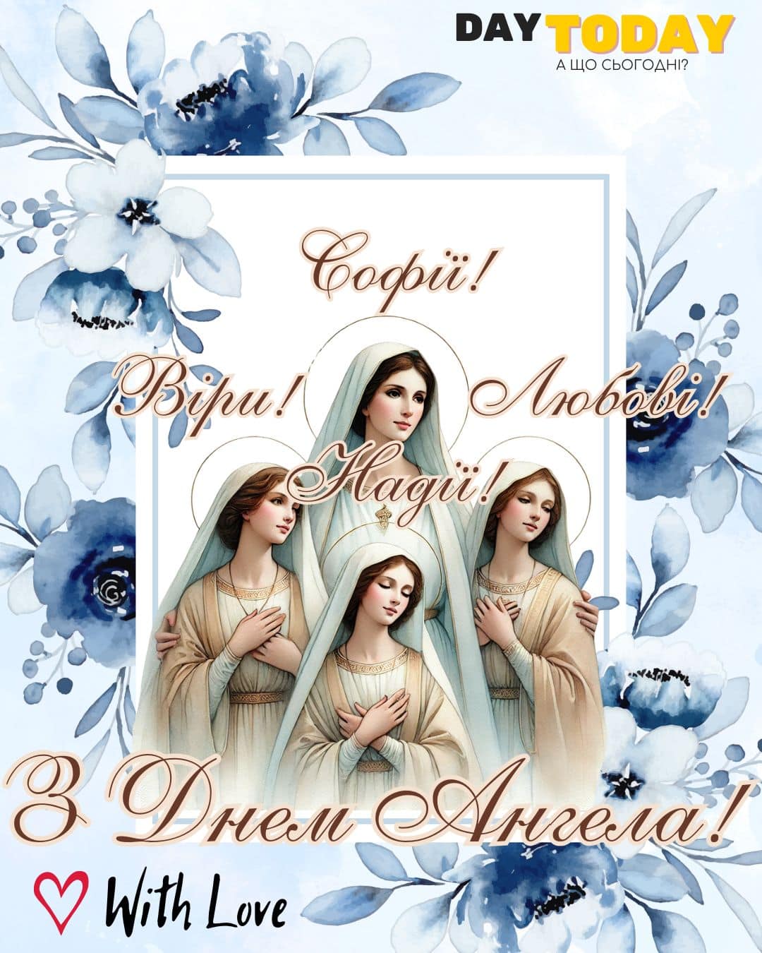 Ушанування пам’яті мучениць Віри, Надії, Любові (грецькою відповідно Пістіс, Елпіс і Агапе) та матері їхньої Софії за новоюліанським календарем відбувається 17 (30) вересня кожного року. Перші згадки про святу Софію та доньок датуються II століттям.