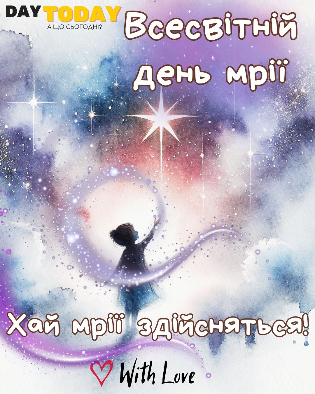 Всесвітній день мрії – це єдине у світі свято, створене спеціально для того, щоб надихнути людей, сім’ї, школи, бізнеси й цілі спільноти приділити час своїм ідеям, цілям і мріям та зробити крок до їхнього втілення на благо світу.